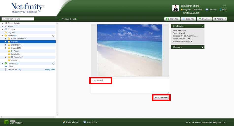 To add a comment type in the comments box and click the ‘Post Comment’ button. The comment will be added against the file and a date/time stamp will be added to show when you made the comment.