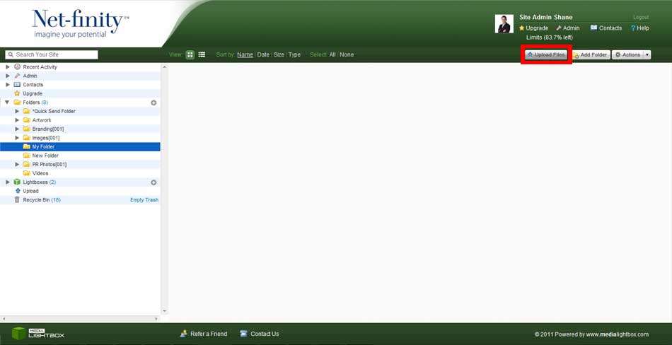 You can access the Upload section, by clicking on Upload Files in the top-right hand of the screen in the Folders section, or by clicking on the Upload tab on the navigation menu. Here you will have the option of downloading the Media Lightbox Desktop Application to upload files, or directly uploading them to a folder of your choice. If you decide to do this directly, then you click on the folder you wish to upload to, causing the Upload Files pop-up to appear. You can click on the Select Files button, to explore your computer for files to upload. Once you have found the files, highlight them and click Open. You can also drag and drop files from your computer directly into the pop-up to upload them.