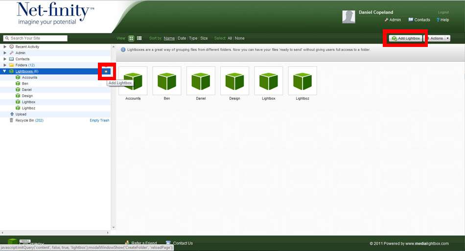 To create a new Lightbox, select the Lightbox tab on the navigation bar and click on the Add Lightbox option. A pop-up window will appear allowing you to enter the name of the Lightbox. When you have entered the name, click the Add Lightbox link to complete the action.