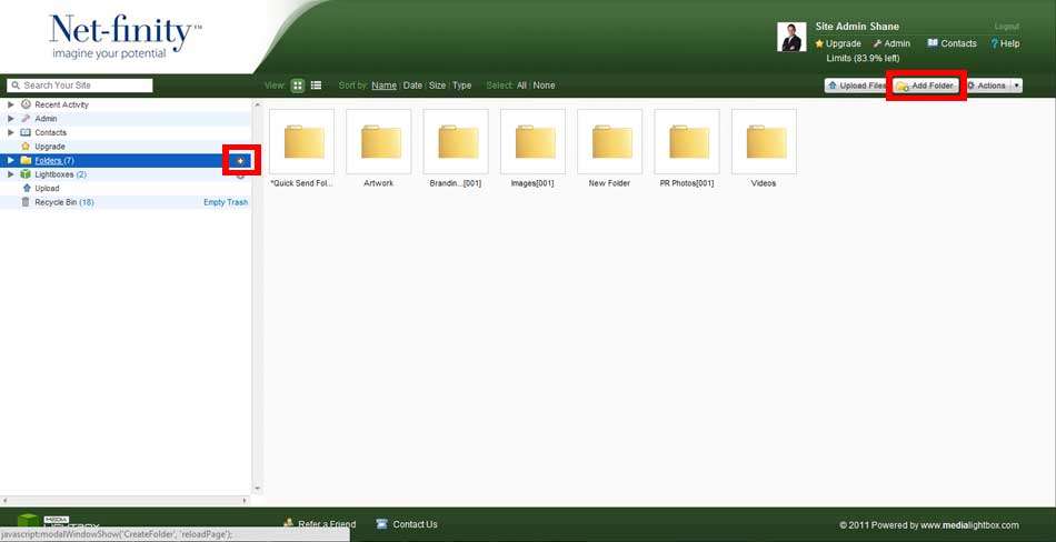 To create a new folder select the Folders tab on the navigation bar and select the Add Folder option. A new file will be created and displayed at the beginning of your folder list, with a default folder name. You will then be allowed to name the folder with a new name if you want.