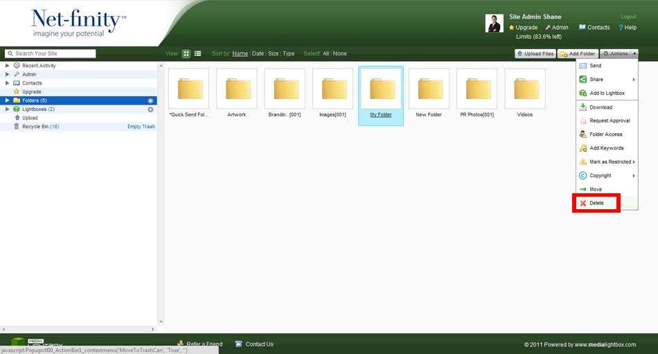 To delete a folder or sub-folders, simply highlight the required folder and select the 'Delete' option from the drop-down action menu. A dialog window will appear asking you if you are sure you want to delete your selected folder and its contents.
