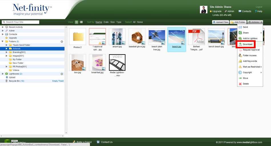 A pop-up window will then appear where the recipient can select a download option. In the case of image files, the system automatically splits the files into different size formats providing you with the option to download the original source file or smaller alternatives of the original file.