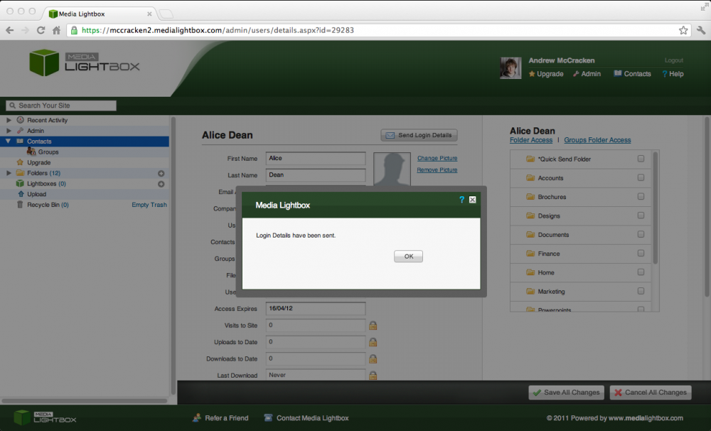 - A new screen will appear saying the login details have been sent click 'Ok' to return to the contact screen