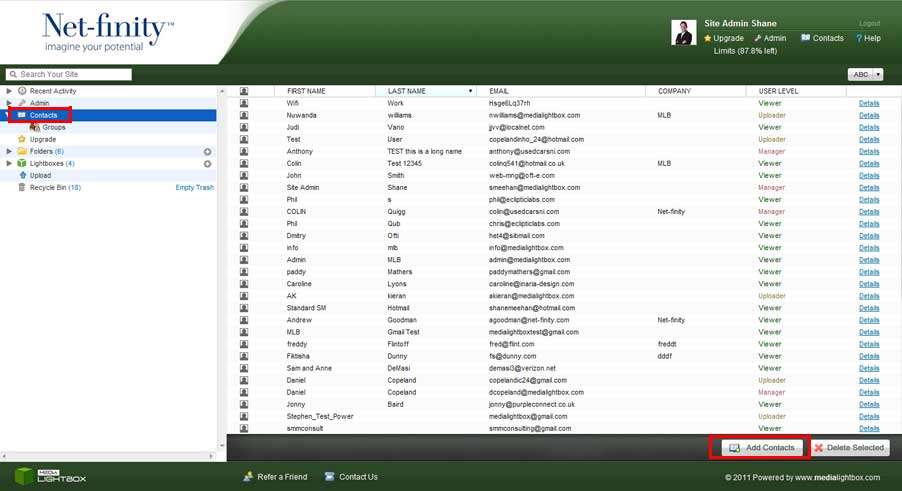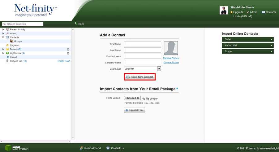 To add a new contact, click on the Contacts tab on the navigation menu.  Next, click on the Add Contacts button in the bottom-left hand corner of the screen.  This will take you to the Add a Contact screen, where you can add the contacts First Name, Last Name, Email Address and Company Name.  The user level of the Contact can be selected by clicking on the User Level drop-down list.