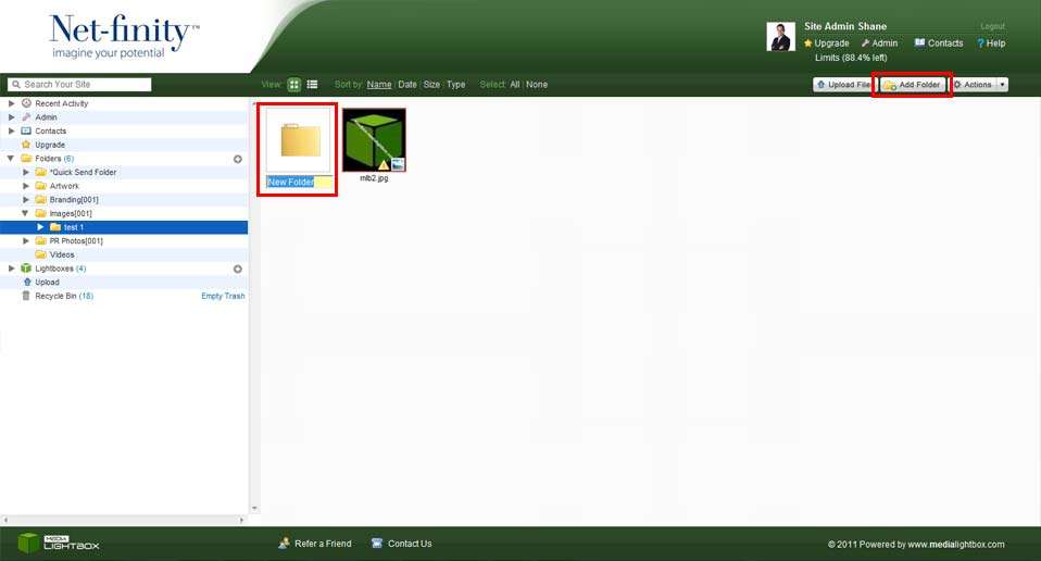 You can also create a new folder by clicking on the “Add Folder” button in the top-right hand corner of the screen, when in the folders section.  This will automatically create a folder, which will then enable you to name the folder.  If you click away from the folder without naming it, it will automatically use the default name.