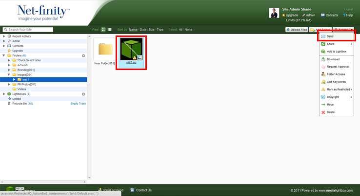 Files can be sent individually or as a group of files.  To send a file highlight it by clicking on, or highlight a number of files to send by clicking and dragging to cover all the files you want send.  Next, click on the Actions menu in the top-right hand corner, and click Send.