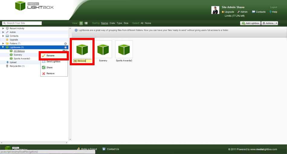 A Lightbox name can be edited at anytime.Simply double-click on the name of the Lightbox or highlight a Lightbox and select Rename from the drop-down actions menu.This allows you to then edit the text.After editing the text, click on the Lightbox to finalise the edit.