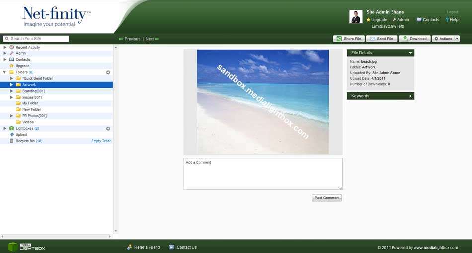 The watermark will be associated with the sub-domain name that you created for your site. For example, if your site was: https://someone.medialightbox.com then your watermark will be:someone.medialightbox.com